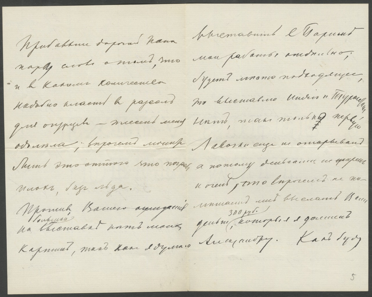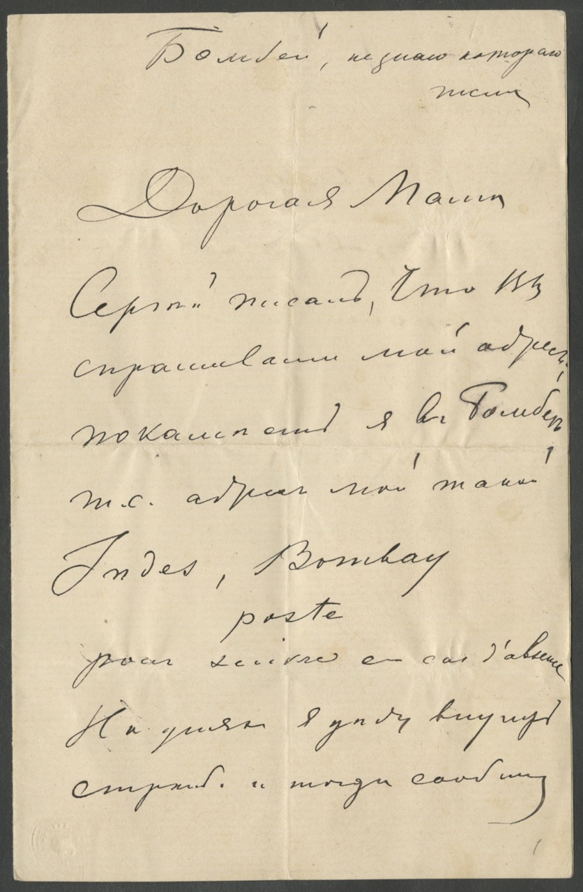ВЕРЕЩАГИН Василий Васильевич. Письма (5) отцу Василию Васильевичу и матери Анне Николаевне Верещагиным. Бомбей, Париж и др. 1874–1878 гг., б. г., б. д. 7 л.