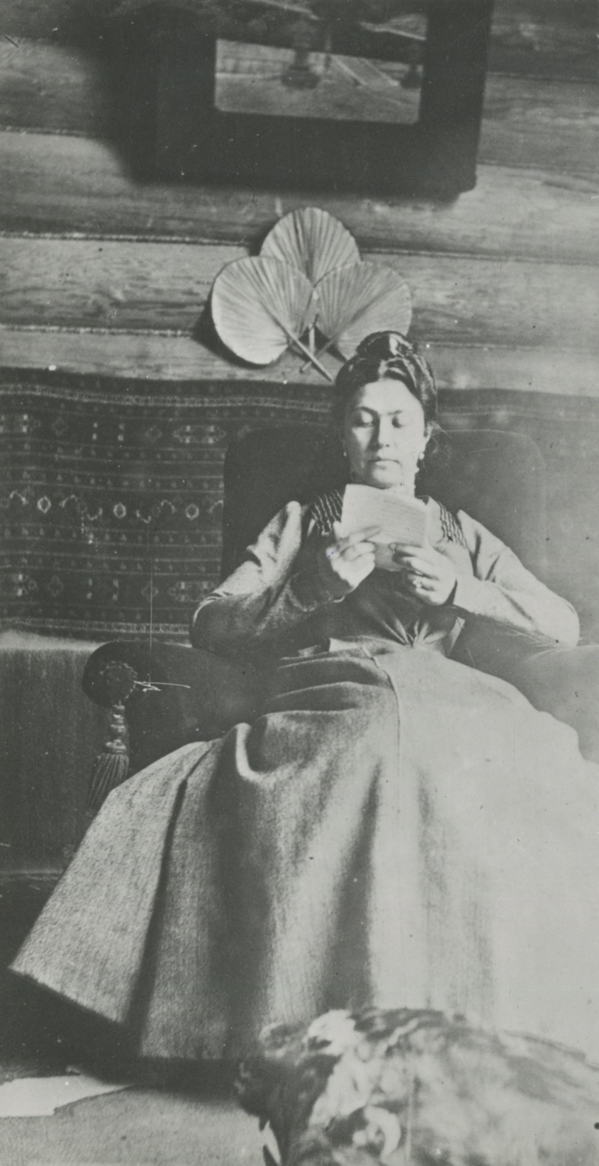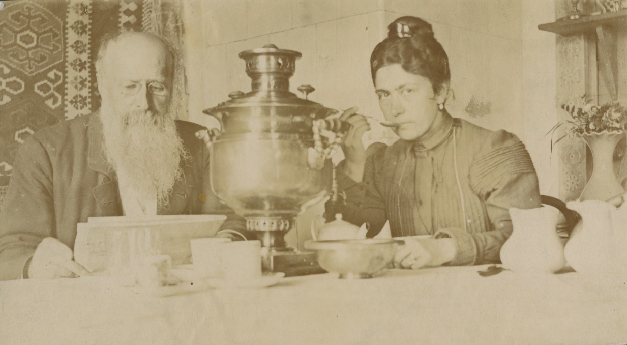 В. В. Верещагин с женой в своем доме в Нижних Котлах. Послеобеденное чтение газет. Копия