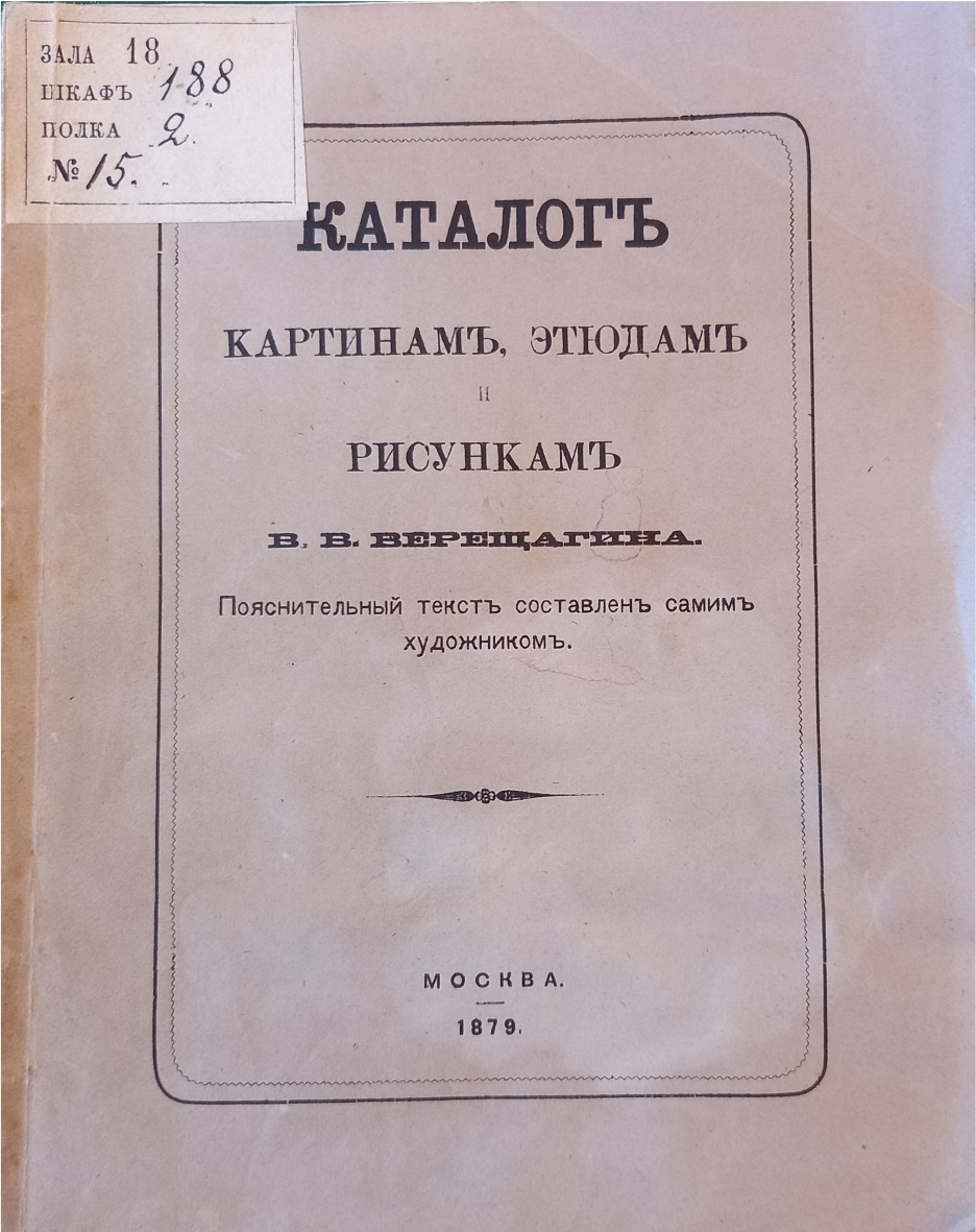 Каталог картинам, этюдам и рисункам В. В. Верещагина / пояснительный текст составлен самим художником. – Москва, 1879.
